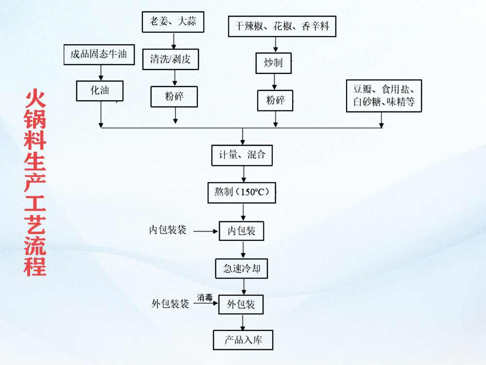 熬制合格后的产品成液态流体,流动性较好需及时转入火锅料包装机内,进行内包装,包装规格号为 50g/袋、150g/袋、300g/袋、400g/袋。